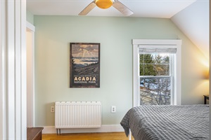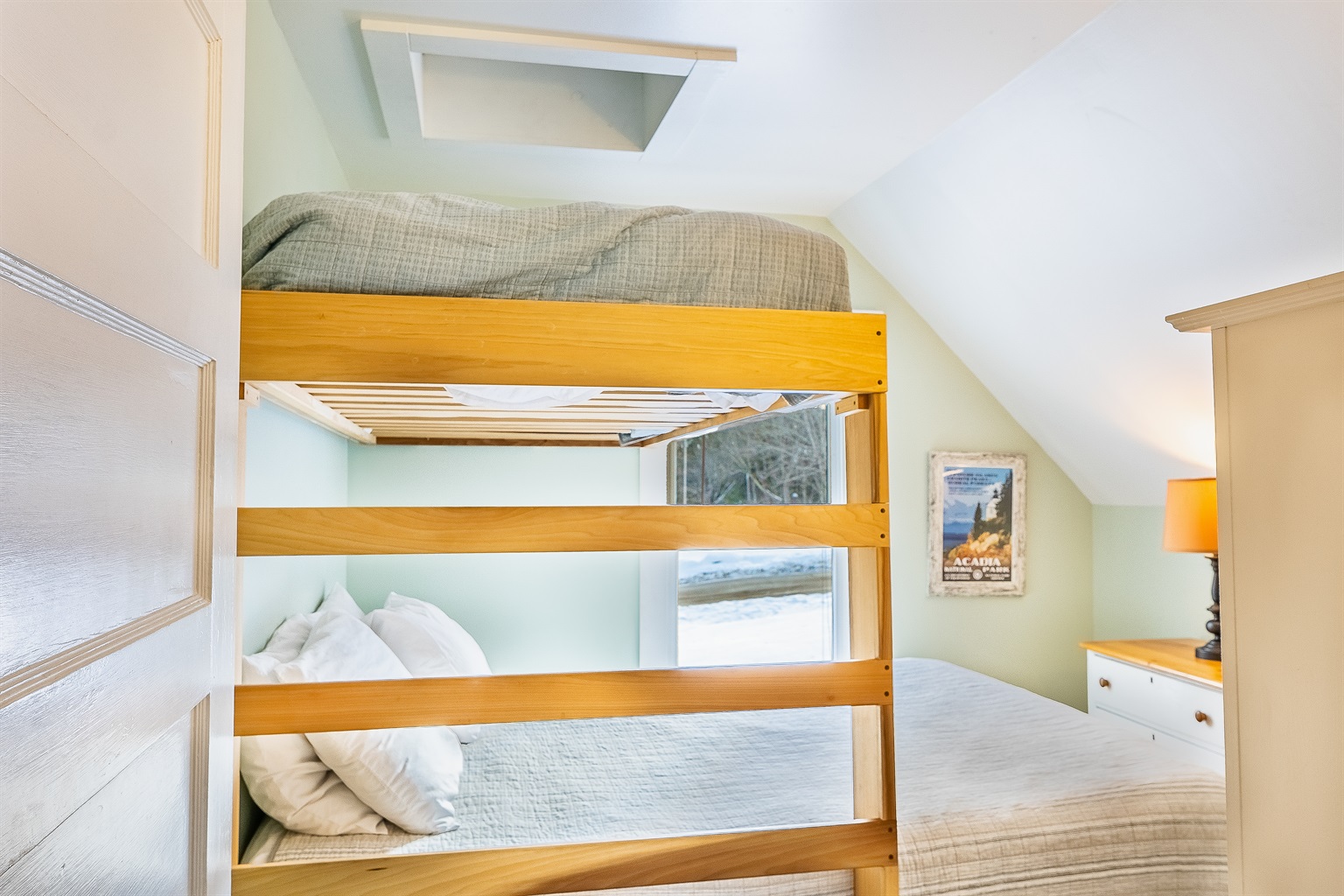 The Bedrooms: All three bedrooms are located on the second floor. Two of these feature custom built-in bunks, giving the rooms a unique, cozy feel that works well for families or groups looking for that traditional Maine cottage experience. For your comfort, in-window AC units are provided in each bedroom.
