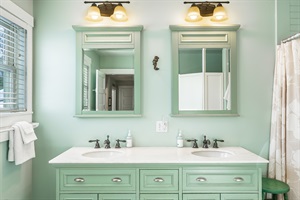 The upstairs bathroom provides plenty of space for your group with a double vanity and custom sea-glass green cabinetry. Bright and airy, it features a full bathtub and shower, making it easy for everyone to get ready for the day.