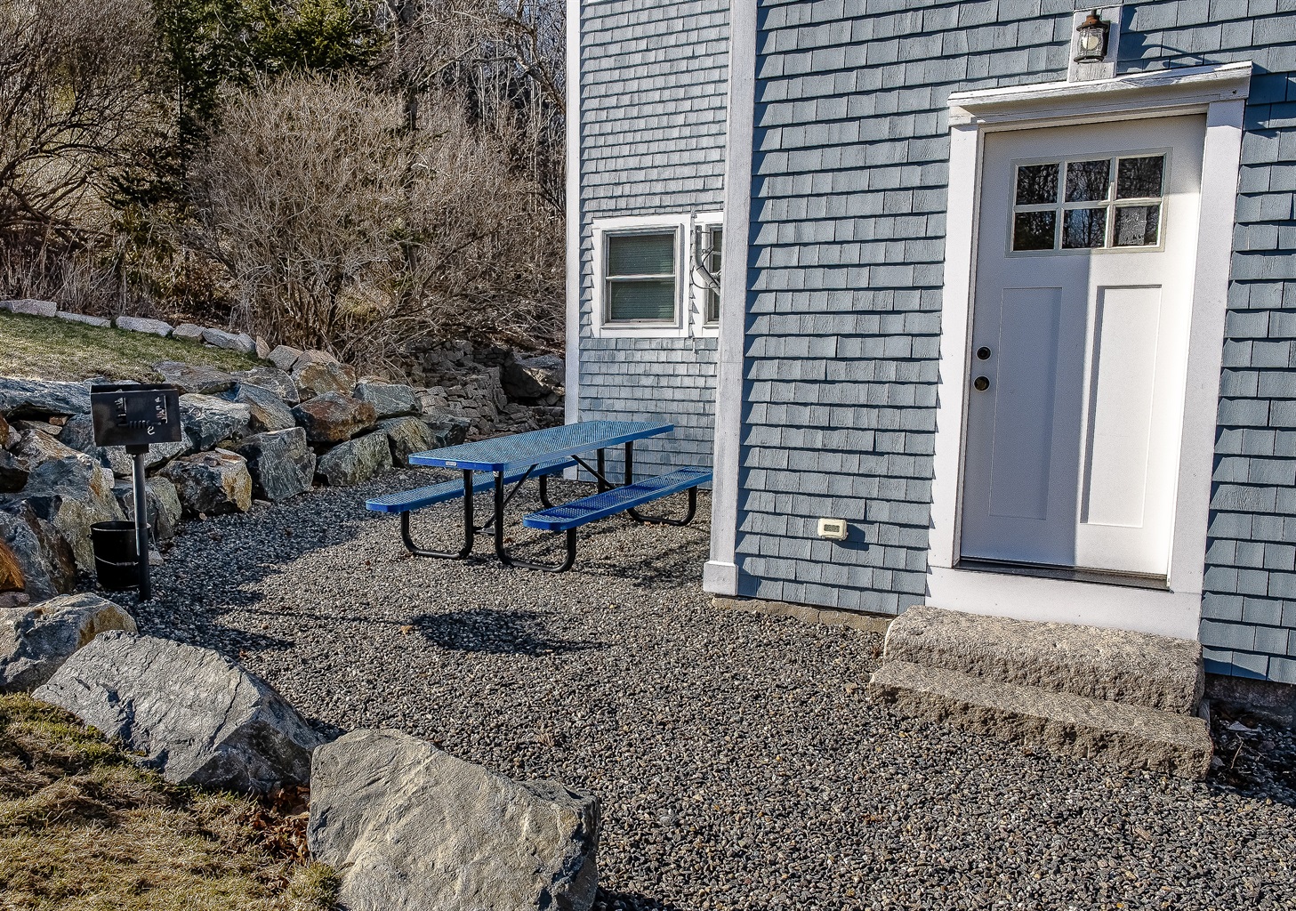 A classic picnic table is ready for your group, nestled against a retaining wall of genuine Maine granite. This dedicated outdoor space, featuring a built-in charcoal grill, provides a relaxed, authentic atmosphere for refuel and recovery after your hike.