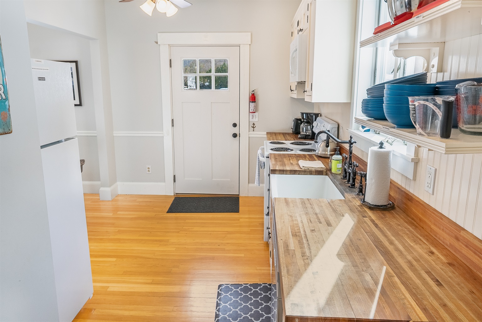 Kitchen and Baths: Tucked into the back corner is the kitchen, recently updated with butcher block countertops. A secondary door leads directly from the kitchen to the grilling area, making it easy to prep and enjoy meals outside. We have fully modernized both bathrooms. The downstairs bathroom includes the washer and dryer, while the second full bathroom is located upstairs near the bedrooms.