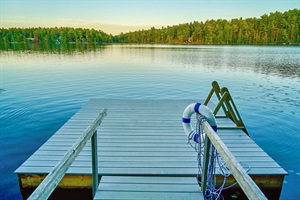 The outdoor setup is what makes Northern Nest truly special. The large lakeside deck is equipped with a propane grill and an outdoor dining table, creating a seamless flow for alfresco meals. From the deck, steps lead down to the grass and straight down to your private dock with a swim ladder.