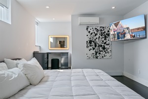 Experience total tranquility in the primary bedroom. This room features a King bed, dedicated air conditioning, and remote-controlled blackout blinds (located on the wall to the left as you enter). The ensuite bathroom offers a spa-like experience with a multi-head shower system, including a luxury waterfall showerhead.